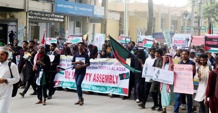 ফিলিস্তিনের স্বাধীনতাকামী সশস্ত্র বাহিনী হামাসের চলমান অভিযানের প্রতি পূর্ণ সমর্থন জানিয়ে সমাবেশ করেছে রাজশাহী বিশ্ববিদ্যালয়ের (রাবি) শিক্ষার্থীরা। একই সঙ্গে ফিলিস্তিনের মুসলমানদের ওপর ইসরায়েলের হত্যাযজ্ঞ, নির্যাতন, বোমা হামলার তীব্র নিন্দা ও প্রতিবাদ জানান তারা।