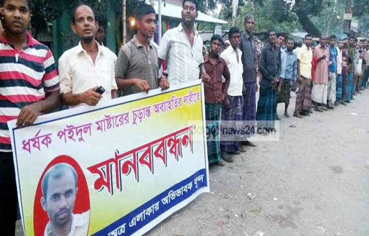 একাধিক ছাত্রীকে প্রেমের ফাঁদে ফেলে ধারণ করা নগ্ন ভিডিওচিত্র ও ছবির মাধ্যমে তৈরি পর্ণগ্রাফির মূলহোতা শিক্ষক পইদুল ইসলামের গ্রেফতার ও শাস্তির দাবিতে জামালপুর ভগদগাজী এলাকার অভিভাবক ও প্রাক্তন শিক্ষার্থীদের ব্যানারে মানববন্ধন ও প্রতিবাদ সমাবেশ করা হয়েছে।