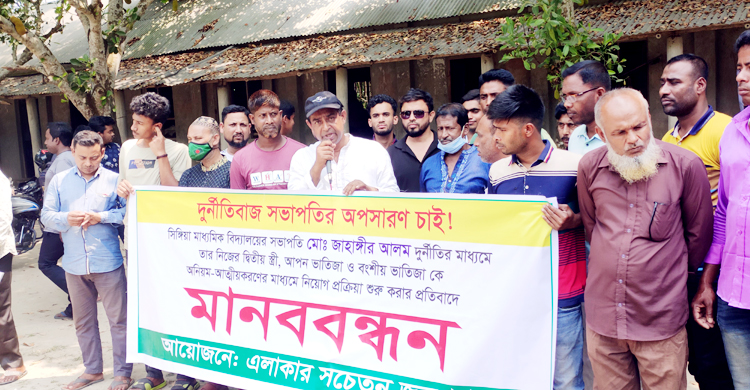 বক্তারা বলেন, হবখালী ইউনিয়নের সিঙ্গিয়া মাধ্যমিক বিদ্যালয় পরিচালনা কমিটির সভাপতি জাহাঙ্গীর আলম অনিয়ম করে আয়া পদে স্ত্রী নাদিরা সুলতানাকে, পরিচ্ছন্নতাকর্মী পদে বড় ভাইয়ের ছেলে রাসেল মোল্যাকে এবং অফিস সহায়ক পদে বংশের ভাইপো সালমান মোল্যাকে নিয়োগের সব ধরনের অপচেষ্টা চালিয়ে যাচ্ছেন। এছাড়া বিদ্যালয় উন্নয়নের নামেও দুর্নীতি করেছেন। সভাপতি জাহাঙ্গীর আলমকে দ্রুত অপসারণ করে বিদ্যালয় সুষ্ঠুভাবে পরিচালনার জন্য সংশ্লিষ্টদের হস্তক্ষেপ কামনা করেন বক্তারা।