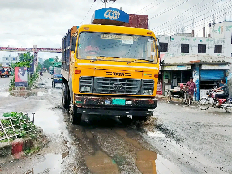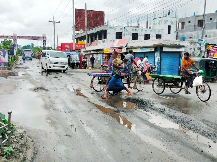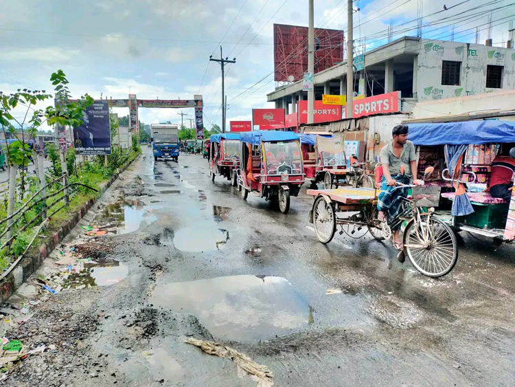 শুক্রবার (২৬ আগস্ট) সরেজমিন দেখা যায়, গোলচত্বর সংলগ্ন পশ্চিম-উত্তর পাশের সড়ক দেবে কয়েকটি সরু খাল ও ছোট-বড় গর্তের সৃষ্টি হয়েছে। সেখানে বৃষ্টির পানি জমে আছে। ক্ষত সৃষ্টি হওয়া সড়কের পাশের নিচ দিয়ে একদিকে কাত হয়ে যানবাহন চলাচল করছে। ঝাঁকুনি খেতে খেতে ইজিবাইক, মোটরসাইকেল ও বাইকেল চলছে। এ অবস্থায় যানবাহন উল্টে যে কোনো সময় দুর্ঘটনা আশঙ্কা রয়েছে।