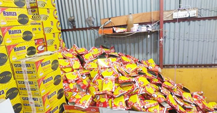 কিশোরগঞ্জের ভৈরবে বিএসটিআইয়ের অনুমোদন ছাড়া বিভিন্ন ব্যান্ডের মশার কয়েল উৎপাদন করার দায়ে তিনটি কারখানাকে এক লাখ ৯০ হাজার টাকা জরিমানা করা হয়েছে। পাশাপাশি কারখানা তিনটি সিলগালা করে দেওয়া হয়।