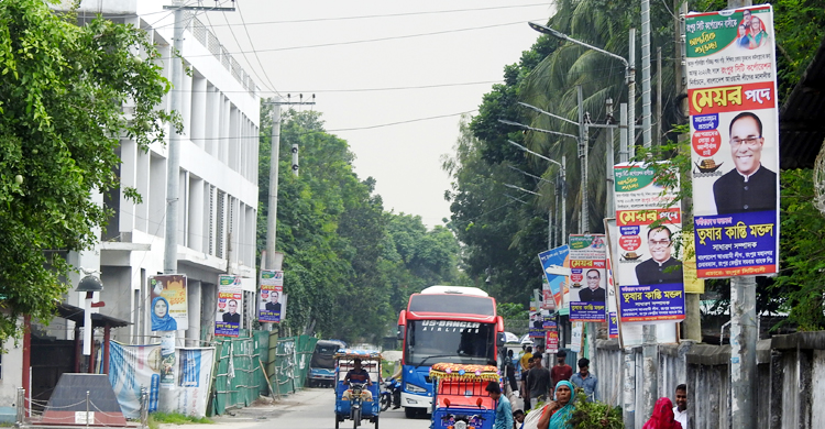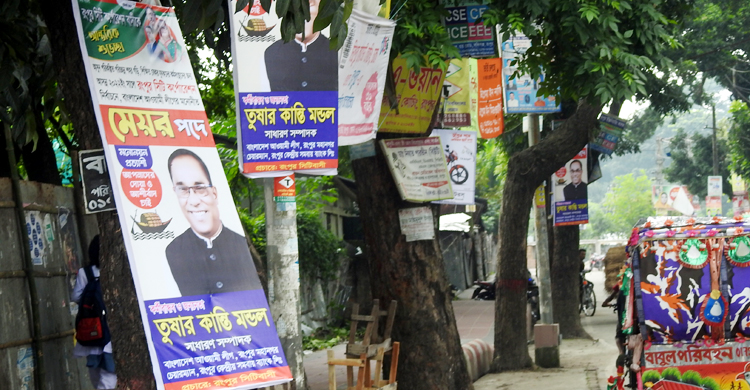 সরেজমিনে ঘুরে দেখা গেছে, শহরের বাস টার্মিনাল, বিমানবন্দর ও সেনানিবাস সড়কসহ বিভিন্ন সড়কে রংপুর সিটি করপোরেশন নির্বাচনের নৌকা প্রতীকে মেয়র পদ প্রত্যাশী তুষার কান্তি রায়ের ব্যানার ও ফেস্টুন ঝুলছে। এসব ব্যানার ও ফেস্টুন বৈদ্যুতিক খুঁটি, গাছ, রোড ডিভাইডার ও দেওয়ালে যত্রতত্রভাবে লাগানো হয়েছে।
