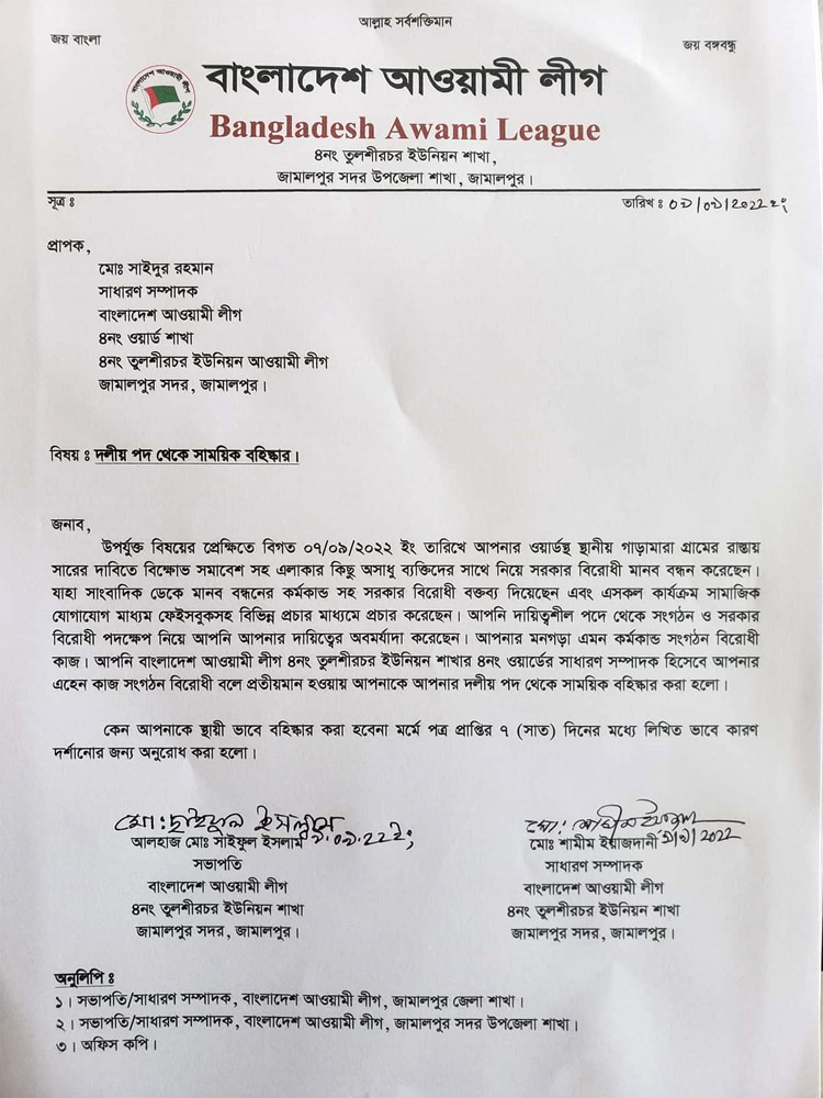 বিজ্ঞপ্তিতে বলা হয়, গত ৭ সেপ্টেম্বর স্থানীয় গাড়ামারা গ্রামের রাস্তায় এলাকার কিছু অসাধু ব্যক্তিদের নিয়ে সারের দাবিতে সরকার বিরোধী স্লোগান, বিক্ষোভ সমাবেশসহ মানববন্ধন করেন সাইদুর রহমান। এছাড়াও সাংবাদিকদের ডেকে এনে সরকার বিরোধী বক্তব্য দিয়েছেন তিনি। এসব কার্যক্রম সামাজিক যোগাযোগ মাধ্যম ফেসবুকসহ বিভিন্ন মাধ্যমে প্রচার হলে দলের ভাবমূর্তি ক্ষুণ্ণ হয়। দায়িত্বশীল পদে থেকে সরকার বিরোধী পদক্ষেপ নেওয়ায় তাকে আওয়ামী লীগের দায়িত্ব থেকে অব্যাহতি দেওয়া হলো।
