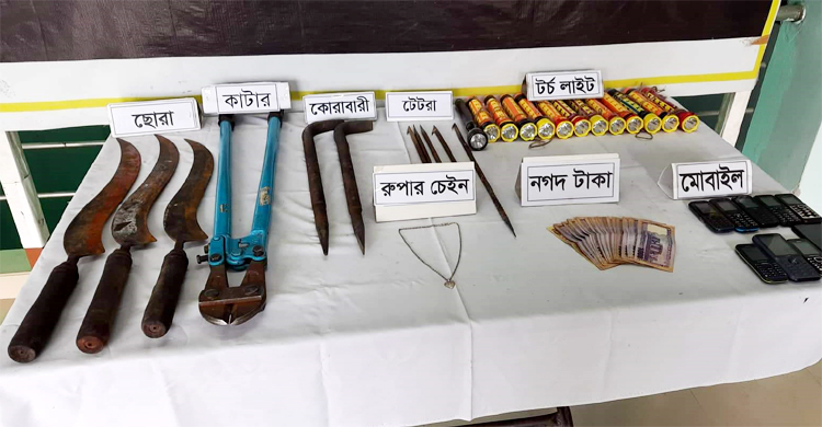 এর আগে মঙ্গলবার (২০ সেপ্টেম্বর) দিনগত রাতে উপজেলার সরাবদী এলাকা থেকে তাদের গ্রেফতার করা হয়। এ সময় তাদের কাছ থেকে সাতটি ককটেল, তিনটি ছুরি, একটি কাটার, দুটি ক্রোবার, পাঁচটি টেঁটা, ১৩টি টর্চ লাইট, একটি রূপার চেন, ২৪ হাজার ৯০০ টাকা ও ৯টি মোবাইল ফোন জব্দ করা হয়।