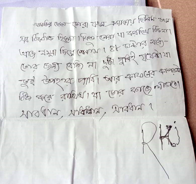 জব্দ করা চিঠিতে লেখা রয়েছে, ‘তোরা যখন এলাকায় ছিলিনি তখন সব ঠিকঠাক ছিল। কিন্তু তোরা যা করছিস তা ঠিক না। আজ নমুনা দিয়ে গেলাম। ৪৮ ঘণ্টার মধ্যে তোর জন্য বেশি না দুটো গুলিই যথেষ্ট, যা তুই উপহার পাবি। আর কাফনের কাপড়টা ঠিক করে রাখিস, যা তোর কাজে লাগবে। সাবধান, সাবধান, সাবধান।’