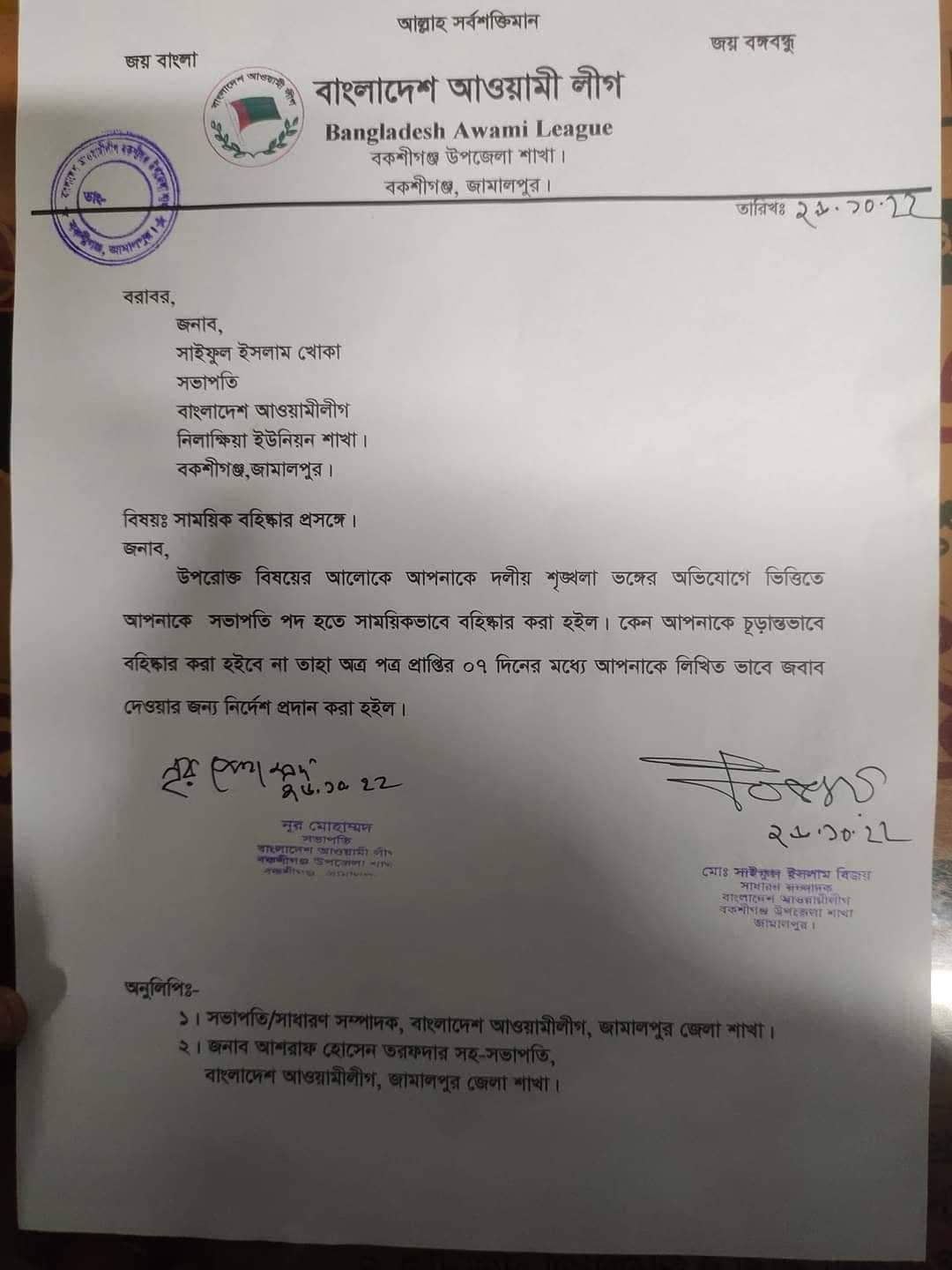 বহিষ্কারাদেশে স্বাক্ষর করেন উপজেলা আওয়ামী লীগের সভাপতি নূর মোহাম্মদ ও সাধারণ সম্পাদক সাইফুল ইসলাম বিজয়।