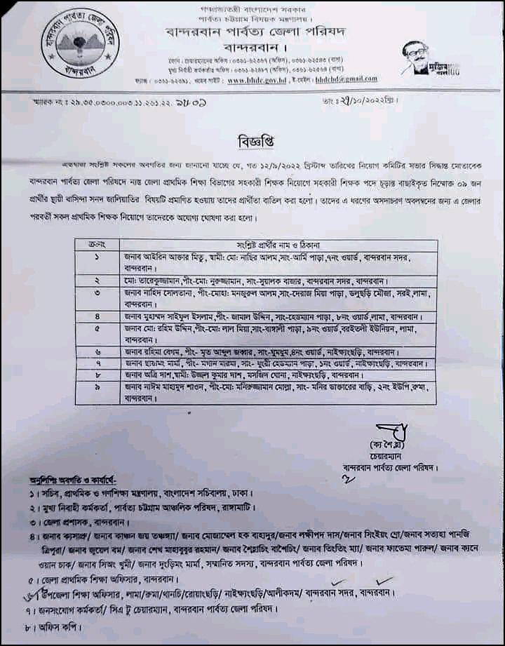 বান্দরবানে প্রাথমিক শিক্ষক নিয়োগে স্থায়ী বাসিন্দা সনদ (বোমাং রাজার বা সার্কেল চিফ সনদ) জালিয়াতির অভিযোগে ৯ শিক্ষকের প্রার্থিতা বাতিল ও স্থায়ীভাবে অযোগ্য ঘোষণা করেছে বান্দরবান পার্বত্য জেলা পরিষদ।