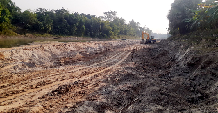 নওগাঁর বদলগাছী উপজেলার ছোট যমুনা নদীর তেজাপাড়া গ্রামের পাশে নদী থেকে বালু উত্তোলন ও এস্কেভেটর দিয়ে মাটি কাটা হচ্ছে। এতে নদীর বাঁধ ও ফসলি জমিহ চার-পাঁচটি গ্রাম হুমকির মধ্যে পড়েছে।