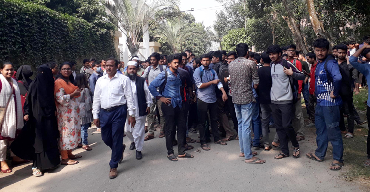 ঘটনাটি ক্যাম্পাসে ছড়িয়ে পড়লে সিভিল ইঞ্জিনিয়ারিং বিভাগের ছাত্ররা উপাচার্যের ভবনের সামনে অবস্থান নেয়। এ সময় তারা অফিস সহায়ক মো. তাজুল ইসলামের শাস্তির দাবিতে বিভিন্ন স্লোগান দিতে থাকে। একপর্যায়ে ক্যাম্পাসের আবাসিক কোয়াটার থেকে মো. তাজুল ইসলামকে আটক করে থানায় নিতে চাইলে শিক্ষার্থীরা বাধা দেন। পরে তাকে দুপুরে তাকে সাময়িক বরখাস্ত করে পুলিশের হাতে তুলে দিলে পরিস্থিতি শান্ত হয়।
