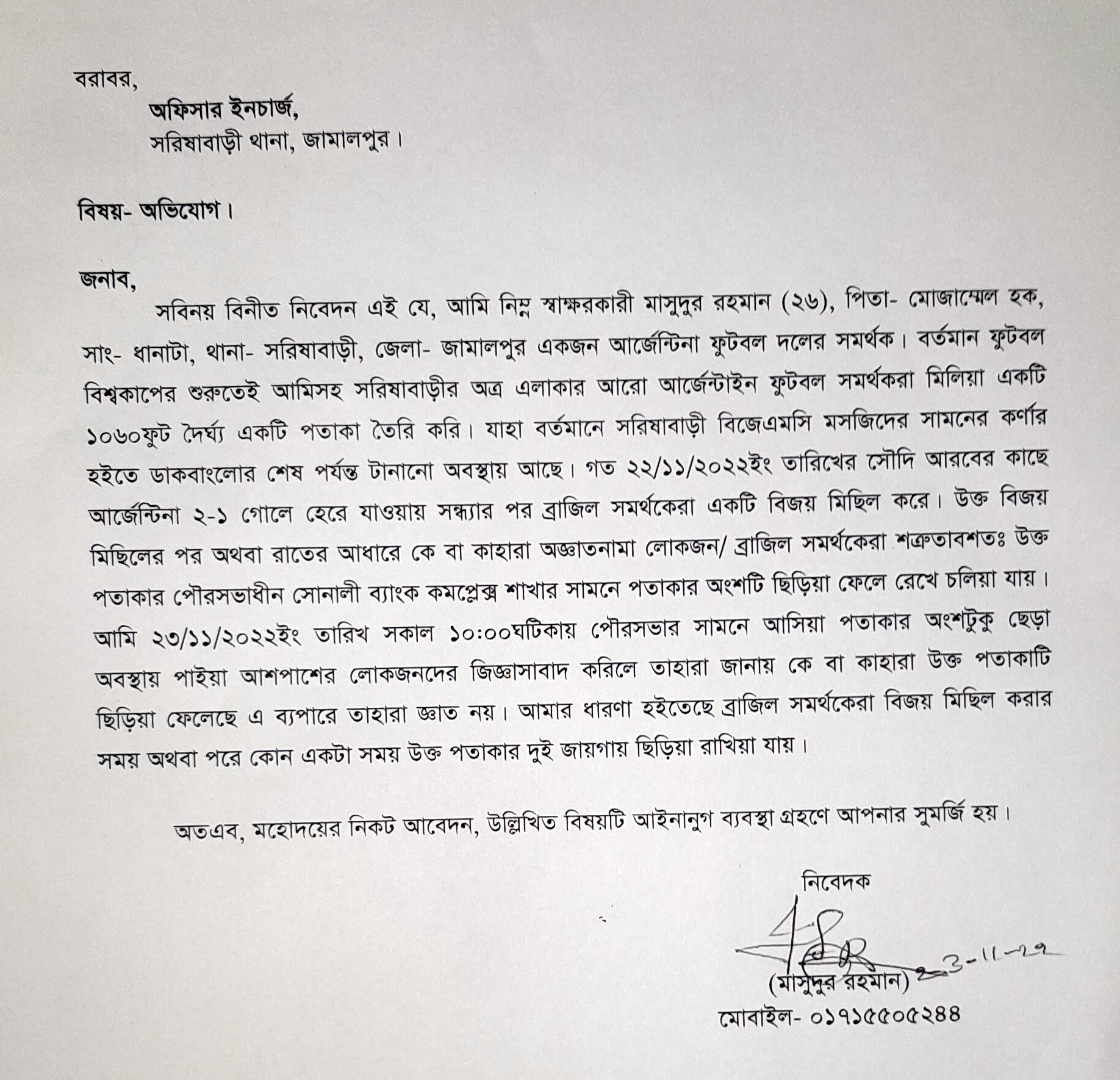 অভিযোগে উল্লেখ করা হয়, ক্রীড়া জগতের সবচেয়ে বড় আসর ফুটবল বিশ্বকাপ শুরু হয়েছে ২০ নভেম্বর। বিশ্বকাপের উম্মাদনা ছড়িয়ে পড়েছে শহর থেকে গ্রামে। যে যেভাবে পারছেন তার প্রিয় দলকে সমর্থন দিয়ে যাচ্ছেন। তারই ধারাবাহিকতায় ৩০ হাজার টাকা খরচ করে এক হাজার ৬০ ফুট দৈর্ঘ্যের পতাকা বানান মাসুদুর রহমান।