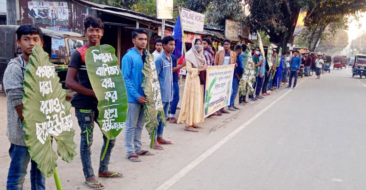 এ সময় বিভিন্ন স্কুল-কলেজের অর্ধশত শিক্ষার্থীদের কলা ও মানকচু পাতায় বিভিন্ন স্লোগান লিখে প্রতিবাদ করতে দেখা যায়।