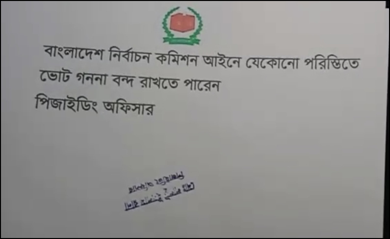 এ সময় ‘বাংলাদেশ নির্বাচন কমিশন আইনে যেকোনো সময় ভোট গণনা বন্ধ রাখতে পারেন প্রিসাইডিং অফিসার’ লেখা প্যাডের পাতা, আইডিকার্ড ও সিল উদ্ধার করা হয়।