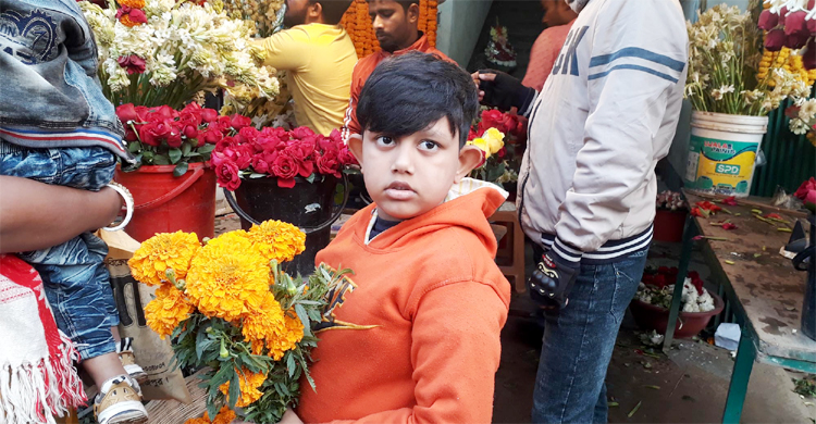 মায়ের সঙ্গে ফুল কিনতে এসেছে দ্বিতীয় শ্রেণির শিক্ষার্থী রুদ্র। কার জন্য ফুল নিচ্ছ প্রশ্ন করতেই বলে উঠলো, আমার ছোট ভাই ও বাবা মায়ের জন্য।