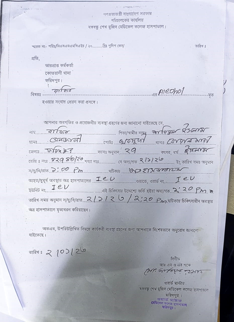 তবে অনুসন্ধানে জানা যায়, সোমবার সকাল ৯টার দিকে ৪২৭৮৩/২৩ সিরিয়ালে ফরিদপুরের বঙ্গবন্ধু শেখ মুজিব মেডিকেল কলেজ হাসপাতালে বন্ধু পরিচয়ে আবির নামের এক তরুণ রাকিবুল ইসলামকে ভর্তি করেন। ভর্তির জায়গায় পুলিশ কেস সিল মারা ছিল। হাসপাতালের রেজিস্টার খাতায় ভর্তির কারণ উল্লেখ করা হয়েছে-‘ভমিটিং অ্যালকোহল পয়জনিং’।