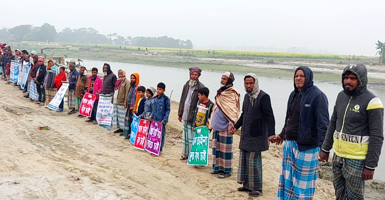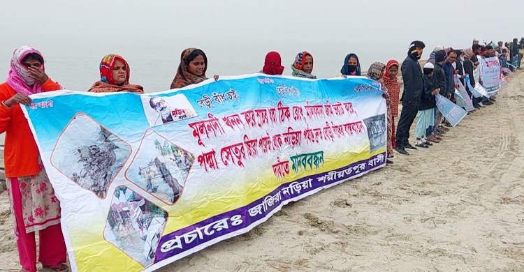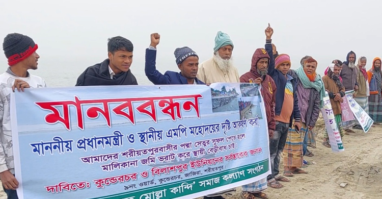 পদ্মা নদীর ভাঙনের কবল থেকে বসতভিটা, ফসলি জমি ও শিক্ষাপ্রতিষ্ঠান রক্ষার দাবিতে মানববন্ধন কর্মসূচি পালন করা হয়েছে।