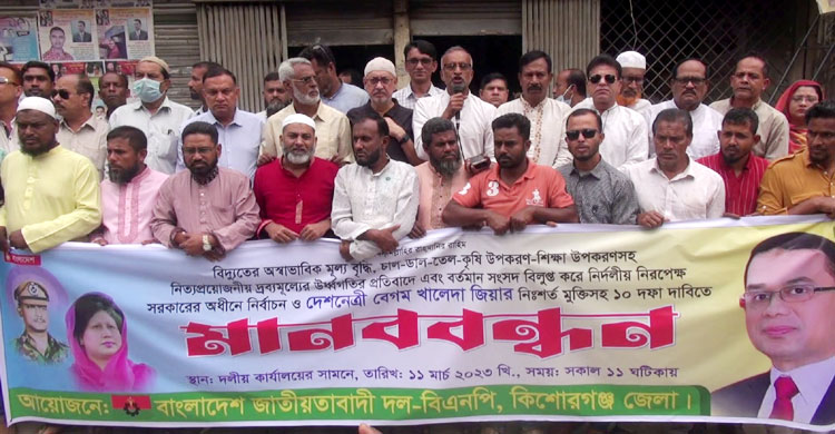 দ্রব্যমূল্যের ঊর্ধ্বগতি, সংসদ ভেঙ্গে নির্দলীয় সরকারের অধীনে নির্বাচন ও খালেদা জিয়ার মুক্তির দাবিতে শনিবার (১১ মার্চ) দুপুরে কিশেরেগঞ্জ জেলা বিএনপি আয়োজিত মানববন্ধন কর্মসূচিতে এসব কথা বলেন ফজলুর রহমান।