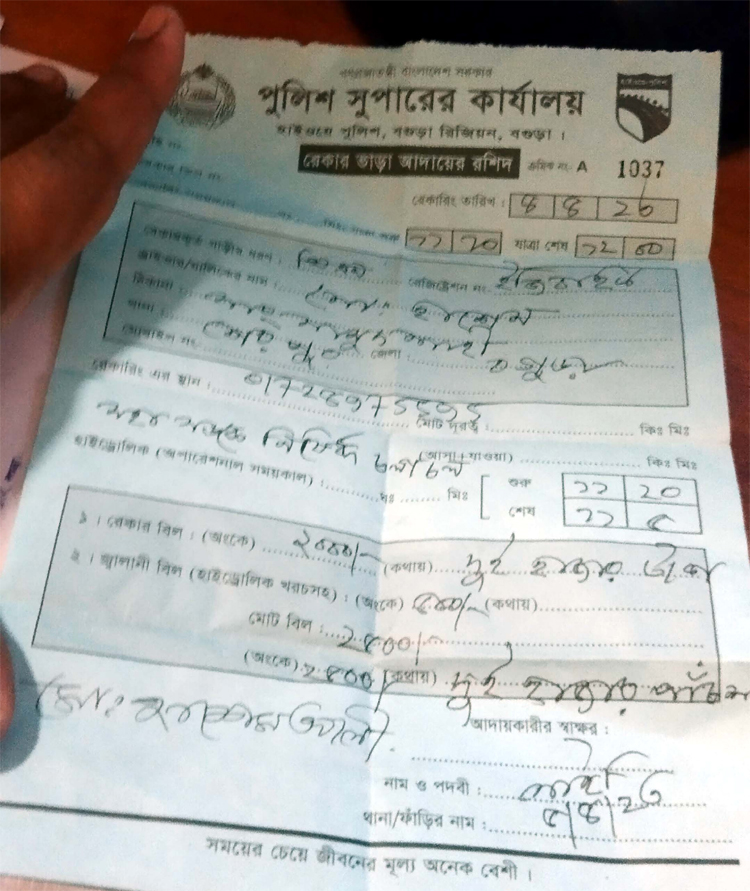 খোঁজ নিয়ে জানা যায়, গত ৫ এপ্রিল শেরপুর শহরের কলেজ রোড এলাকা থেকে একটি অটোরিকশা আটক করেন ‘সাইফ’ নামে হাইওয়ে পুলিশের এক সদস্য। মহাসড়কে চলাচল নিষিদ্ধ এ যানবাহনের মালিকের কাছে মামলার জরিমানা হিসেবে আড়াই হাজার টাকা দাবি করেন। পরে ছোট ভাইয়ের কাছ থেকে টাকা ধার নিয়ে পুলিশকে দেন অটোরিকশার মালিক। পরে তার হাতে রেকার ভাড়া আদায়ের একটি রসিদ দিয়ে ছেড়ে দেওয়া হয়। ওই রসিদে রেকার বিল ২ হাজার ও জ্বালানি তেল বাবদ ৫০০ টাকা লেখা আছে।