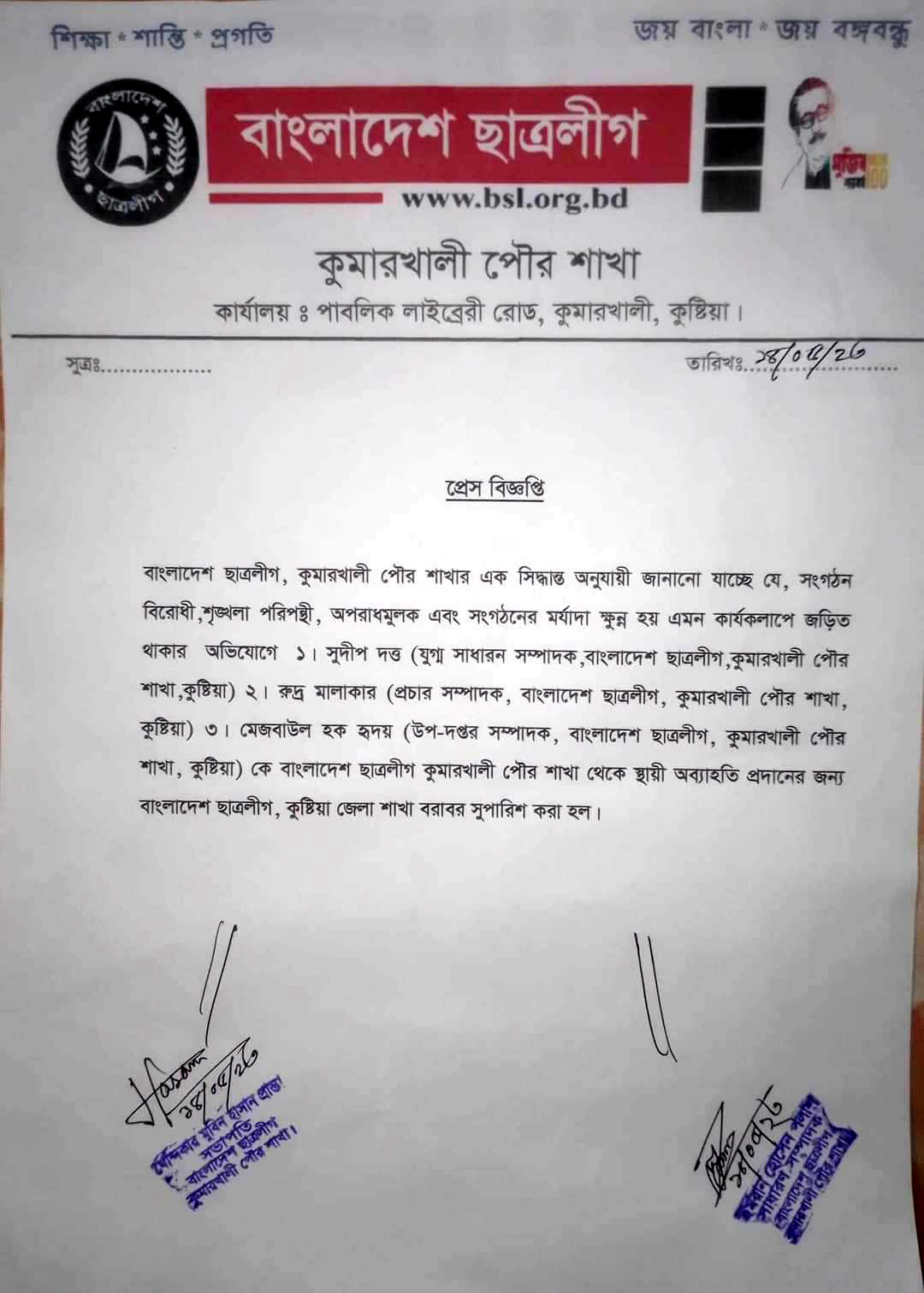 কুমারখালীতে ছাত্রলীগের আরও ৩ নেতাকে অব্যাহতি