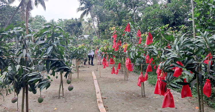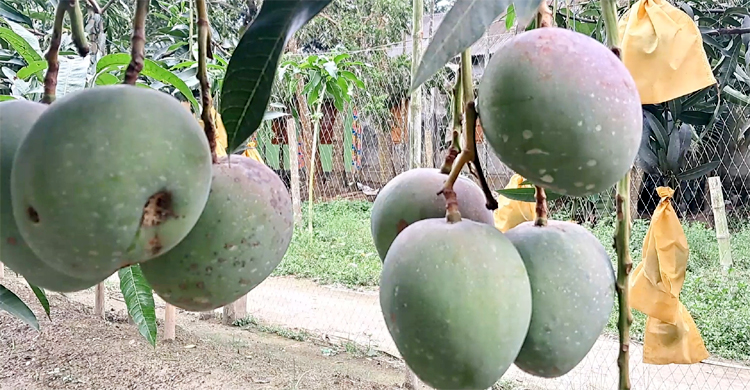 বাগান ঘুরে দেখা গেছে, আম গাছে ঝুলছে তিন রঙের আম। কাঁচা আমে ভরে গেছে বাগান। থোকায় থোকায় ঝুলছে হালকা খয়েরি, হালকা কাঁচা হলুদ ও সবুজ রঙের আম। আম গাছ পোকা-মাকড় থেকে রক্ষা করতে ব্যাগিং করা হয়েছে। কিছু ব্যাগিং আবার খোলা হয়েছে।