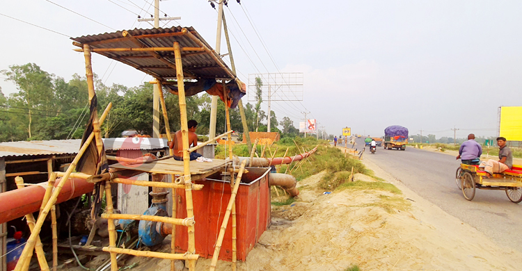 শনিবার (১০ জুন) বিকেলে সরেজমিনে নলকা সেতু এলাকায় গেলে দেখা যায়, সেতু দুটির নিচে দক্ষিণপাশে ফুলজোর নদীতে চারটি বাল্কহেড ভাসছে। এর ওপর দুটি বালু তোলার যন্ত্র বসানো হয়েছে। একটি যন্ত্র থেকে পাইপ নদীতে নামিয়ে দেওয়া হয়েছে। ওই পাইপ দিয়ে নদী থেকে বালু তোলা হচ্ছে। অপর যন্ত্রটি পানির সঙ্গে সেই বালু মোটা লোহার পাইপের মাধ্যমে সামনে ঠেলে দিচ্ছে। মহাসড়কের পাশ দিয়ে প্রায় ৫০০-৬০০ মিটার দূরে বালু গিয়ে পড়ছে সাসেক প্রকল্পের নির্মাণাধীন সার্ভিস সেন্টারে। বালু পড়ে উঁচু হচ্ছে এই প্রকল্পের নিচু অংশ।