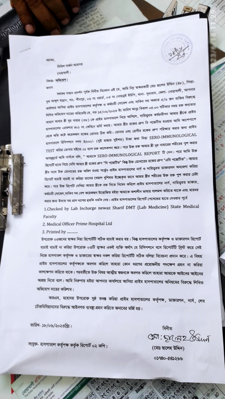 ভুক্তভোগী ছালেহ উদ্দিন জাগো নিউজকে জানান, তার স্ত্রী নুরুন্নাহারের রক্তশূন্যতা দেখা দিলে বৃহস্পতিবার (১৫ জুন) বিকেলে চিকিৎসক তাকে রক্ত দিতে প্রাইম হাসপাতালে ভর্তি করেন। পরে ছালেহ উদ্দিন কয়েকজন রক্তদাতা ঠিক করেন। তবে হাসপাতাল কর্তৃপক্ষ ভুল রিপোর্টের ভিত্তিতে ‘বি’ পজিটিভের জায়গায় ‘এবি’ পজিটিভ রক্ত দেওয়ার প্রস্তুতি নেয়।