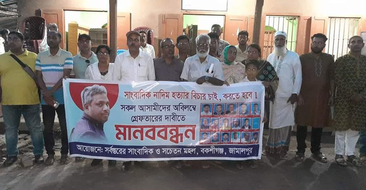 পরে বকশীগঞ্জ পাটহাটি এলাকায় সাংবাদিকদের আয়োজনে এক মানববন্ধন অনুষ্ঠিত হয়। সেখানেও তিনি অংশ নেন।