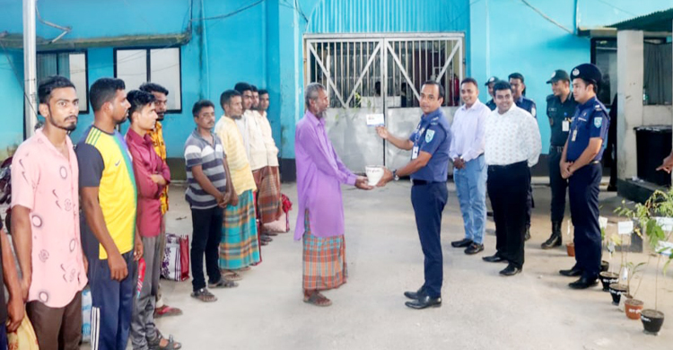 কুড়িগ্রামে কারাবন্দীরা জামিনে মুক্ত হয়ে বাড়ি ফেরার সময় কারা ফটকে তাদের হাতে একটি করে গাছের চারাসহ শুভেচ্ছা কার্ড তুলে দিচ্ছেন পুলিশ সদস্যরা।