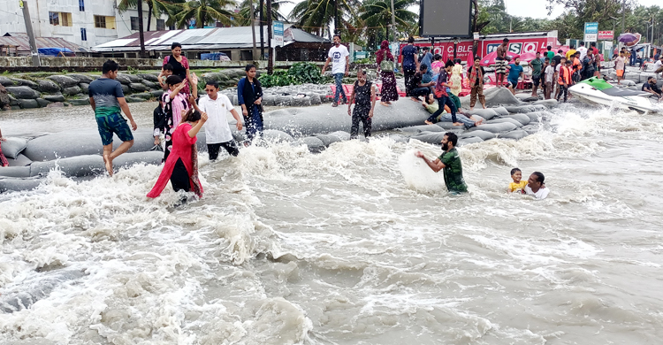 শনিবার (৫ আগস্ট) কুয়াকাটা সমুদ্র সৈকত ঘুরে দেখা যায়, সাগর উত্তাল। একের পর এক উঁচু উঁচু ঢেউ কূলের দিকে ছুটে আসছে। সাপ্তাহিক ছুটির দিন হওয়ায় বালিয়াড়িতে উল্লাসে মেতেছেন পর্যটকরা। উত্তাল ঢেউয়ের মধ্যেই তারা গোসল করছেন।