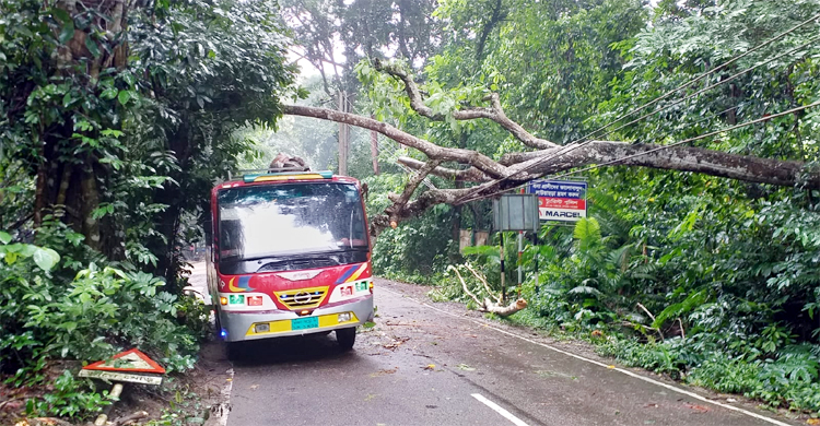ভারী বর্ষণে মৌলভীবাজারের কমলগঞ্জের লাউয়াছড়া জাতীয় উদ্যানের প্রধান ফটক এলাকায় সড়কের ওপর গাছ উপড়ে পড়ে। ছিঁড়ে যায় বৈদ্যুতিক তারও।