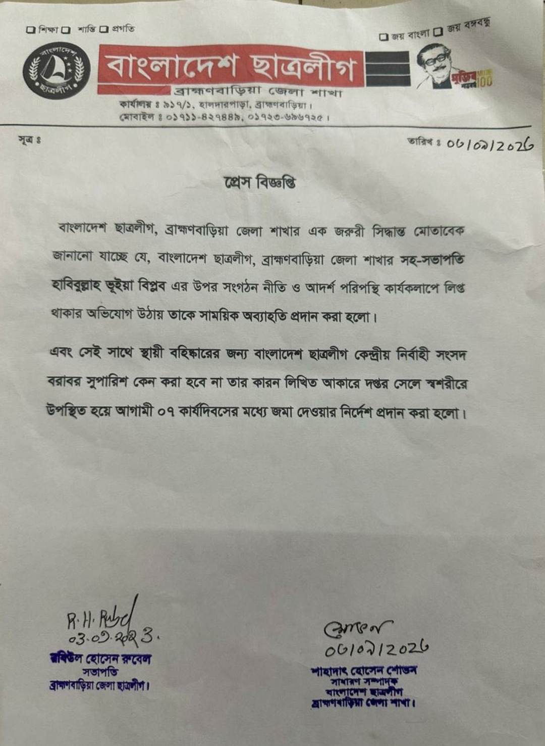 প্রেস বিজ্ঞপ্তিতে বলা হয়, বাংলাদেশ ছাত্রলীগ, ব্রাহ্মণবাড়িয়া জেলা শাখার সহ-সভাপতি হাবিবুল্লাহ ভূইয়া বিপ্লবের উপর সংগঠন নীতি ও আদর্শ পরিপন্থি কার্যকলাপে লিপ্ত থাকার অভিযোগ ওঠায় তাকে সাময়িক অব্যাহতি প্রদান করা হলো। এবং সেই সঙ্গে স্থায়ী বহিষ্কারের জন্য বাংলাদেশ ছাত্রলীগ কেন্দ্রীয় নির্বাহী সংসদ বরাবর সুপারিশ কেন করা হবে না তার কারণ লিখিত আকারে দপ্তর সেলে স্বশরীরে উপস্থিত হয়ে আগামী ৭ কার্যদিবসের মধ্যে জমা দেওয়ার নির্দেশ প্রদান করা হলো।