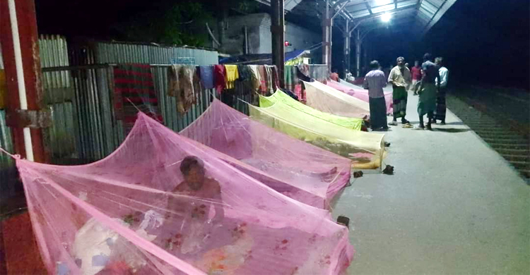 সরেজমিনে দেখা যায়, রেলস্টেশনের মূল শেডের নিচে টাঙানো প্রায় সারি সারি শতাধিক মশারি। একেকটি মশারির মধ্যে ২ থেকে ৩ জন করে শুয়ে আছেন। কেউবা বসে আছেন। আবার অনেকে গরমের কারণে বাইরেই বসে আছেন। কেউ কেউ ঘোরাফেরা করছেন।