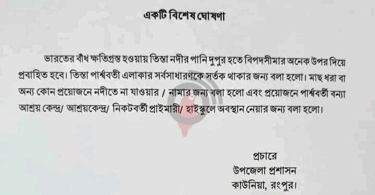 ভারতের উত্তর সিকিমে ভয়াবহ বন্যা ও বাঁধ ভেঙে যাওয়ায় তিস্তা নদীর পানি বৃদ্ধি পেয়ে বাংলাদেশ অংশে বিপৎসীমা অতিক্রম করতে পারে। এতে রংপুর, নীলফামারী, লালমনিরহাট, কুড়িগ্রাম ও গাইবান্ধার নদী তীরবর্তী এলাকায় ভয়াবহ বন্যার আশঙ্কা করা হচ্ছে। ফলে নদী পার্শ্ববর্তী এলাকার সর্বসাধারণের সতর্কতা অবলম্বনে এরইমধ্যে মাইকিং শুরু করেছে সংশ্লিষ্ট প্রশাসন।