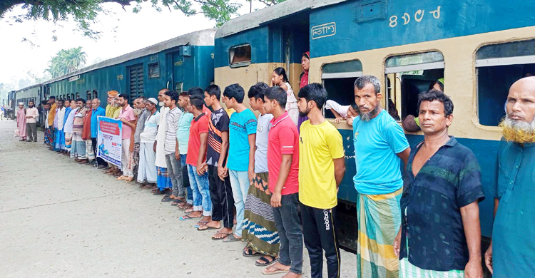 রমনা মেইল চালুর দাবিতে চিলমারীতে ট্রেন আটকে মানববন্ধন