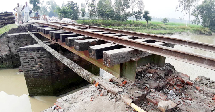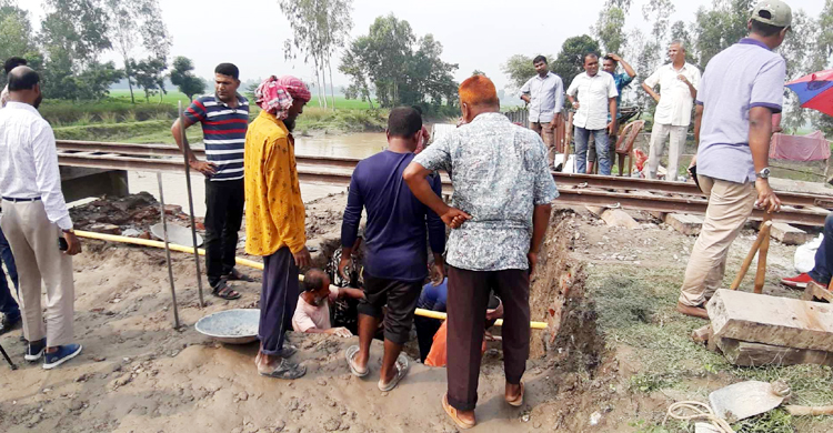 কুড়িগ্রামের রাজারহাটে দেবে যাওয়া রেলসেতু মেরামতের কাজ চলছে। অস্থায়ী ভিত্তিতে এ কাজ করছেন শতাধিক শ্রমিক।