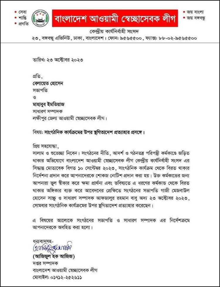 দপ্তর সম্পাদক আজিজুল হক আজিজ বলেন, সংগঠনের নীতি, আদর্শ ও গঠনতন্ত্র পরিপন্থী কর্মকাণ্ডে জড়িত থাকায় ১০ সেপ্টেম্বর লক্ষ্মীপুরের কমিটির কার্যক্রম স্থগিত করা হয়। একইসঙ্গে লক্ষ্মীপুর স্বেচ্ছাসেবক লীগের সভাপতি বেলায়েত হোসেন ও সাধারণ সম্পাদক মাহবুব ইমতিয়াজকে শোকজ করে ঘটনার ব্যাখ্যা চাওয়া হয়। সন্তোষজনক ব্যাখ্যা দেওয়ায় সোমবার (২৩ অক্টোবর) রাতে স্থগিতাদেশ প্রত্যাহার করে কার্যক্রম চালু রাখার নির্দেশ দেওয়া হয়েছে। ভবিষ্যতে সংগঠনবিরোধী কোনো কাজে লিপ্ত হবেন না বলে অঙ্গীকারনামা দিয়েছেন তারা।