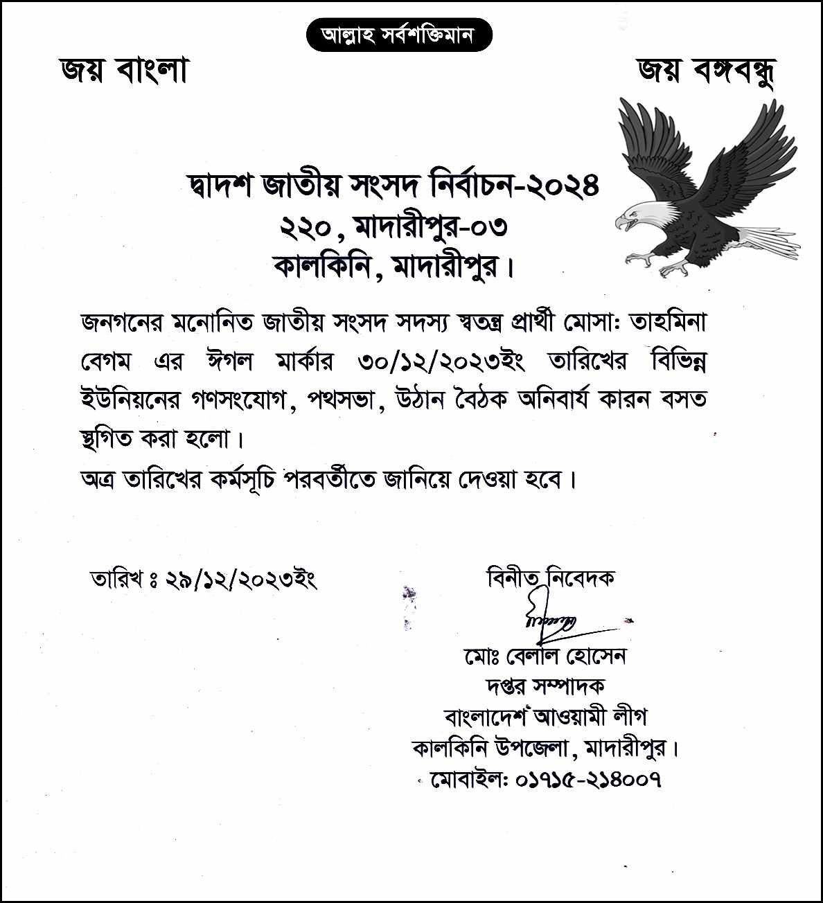 বিজ্ঞপ্তিতে বলা হয়, জাতীয় সংসদ নির্বাচনে স্বতন্ত্র প্রার্থী মোসা. তাহমিনা বেগমের ঈগল মার্কার ৩০ ডিসেম্বর তারিখের বিভিন্ন ইউনিয়নের গণসংযোগ, পথসভা, উঠান বৈঠক অনিবার্য কারণবসত স্থগিত করা হলো।