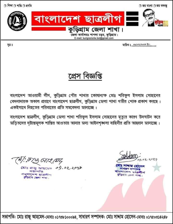 এর আগে কুড়িগ্রাম জেলা ছাত্রলীগের সভাপতি মো. রাজু আহমেদ ও সাধারণ সম্পাদক মো. সাদ্দাম হোসেন স্বাক্ষরিত একটি বিজ্ঞপ্তিতে পৌর আওয়ামী লীগের কোষাধ্যক্ষ শরিফুল ইসলাম সোহানের মৃত্যুর ঘটনায় শোক ও ঘটনার কারণ উদঘাটন করে জড়িতদের শাস্তির দাবি জানিয়ে বিজ্ঞপ্তি প্রকাশ করা হয়।