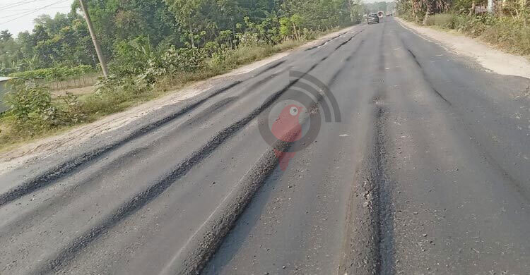 ঝিনাইদহ-যশোর মহাসড়কের কার্পেটিং উঠে উঁচু ঢিবির সৃষ্টি হয়। রোববারের ছবি।