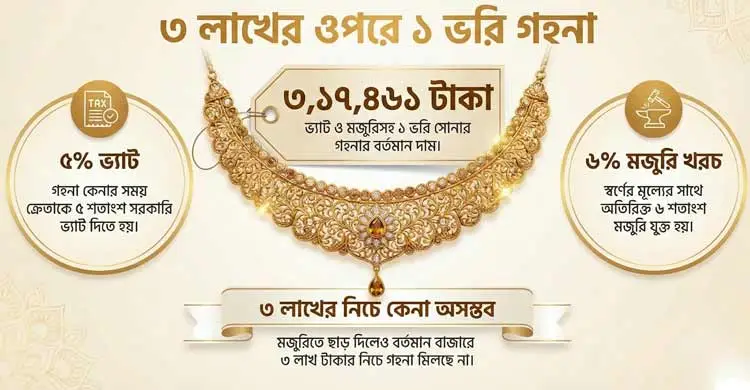 বর্তমানে ৫ শতাংশ ভ্যাট ও ৬ শতাংশ মজুরি যোগ করে এক ভরি সোনার অলংকার কিনতে ক্রেতাদের গুনতে হচ্ছে ৩ লাখ ১৭ হাজার ৪৬১ টাকা। কোনো কোনো ব্যবসায়ী মজুরিতে ছাড় দিলেও ৩ লাখ টাকার নিচে এক ভরি সোনার অলংকার কেনা যাচ্ছে না। এত বেশি দামে সোনা কিনতে মানুষ একেবারে বাধ্য না হলে সিদ্ধান্ত নিচ্ছেন না বলে জানান ব্যবসায়ীরা।