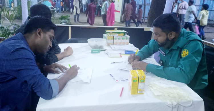 বইমেলায় পুলিশ ব্লাড ব্যাংকে রক্ত দিচ্ছেন পাঠক-দর্শনার্থীরা