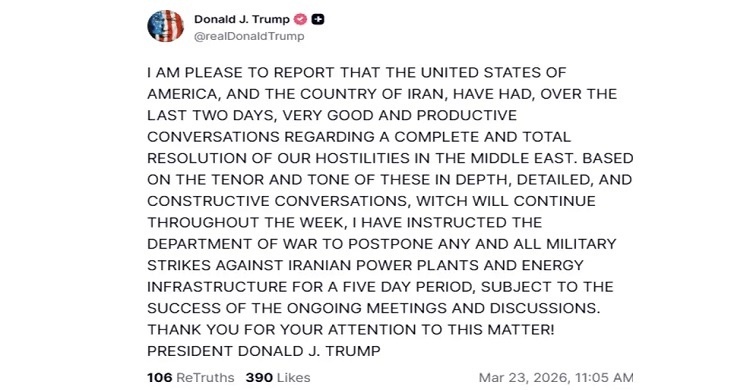 In a statement posted on his Truth Social platform, he said, "I am pleased to report that the United States of America, and the country of Iran, have had, over the last two days, very good and productive conversations regarding a complete and total resolution of our hostilities in the Middle East. Based on the tenor and tone of these in-depth, detailed, and constructive conversations, which will continue throughout the week, I have instructed the Department of War to postpone any and all military strikes against Iranian power plants and energy infrastructure for a five-day period, subject to the success of the ongoing meetings and discussions. Thank you for your attention to this matter!"