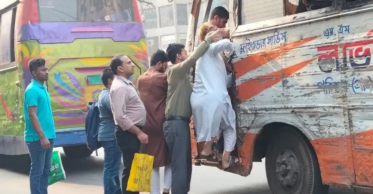 A commuter, Mehedi Hasan, who was seen hanging from the door of a bus, said that waiting for a less crowded vehicle was not an option.
