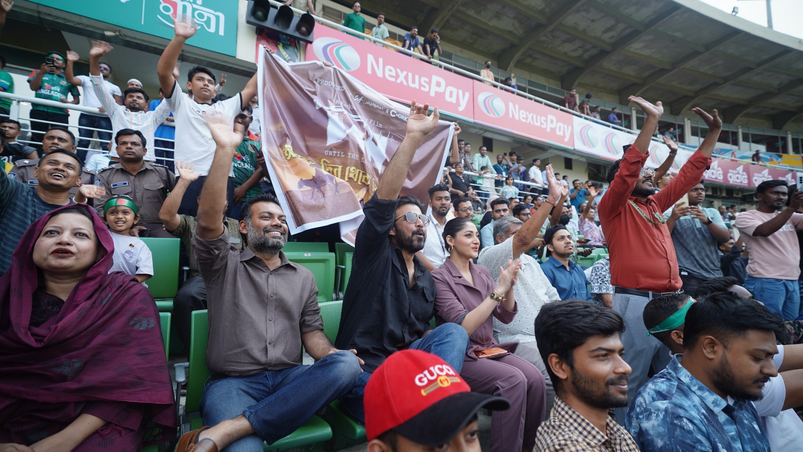 মিরপুর শেরে বাংলা জাতীয় ক্রিকেট স্টেডিয়ামে রোববার (১৫ মার্চ) বাংলাদেশ ও পাকিস্তানের মধ্যকার তৃতীয় ওয়ানডে ম্যাচে গ্যালারিতে উপস্থিত থেকে টাইগারদের জয়ে উৎসাহ জুগিয়েছে বহুল আলোচিত ‘দম’ চলচ্চিত্রের টিম। ম্যাচে টানটান উত্তেজনার মাঝে শোবিজ তারকাদের উপস্থিতি গ্যালারিতে এক নতুন মাত্রা যোগ করে।