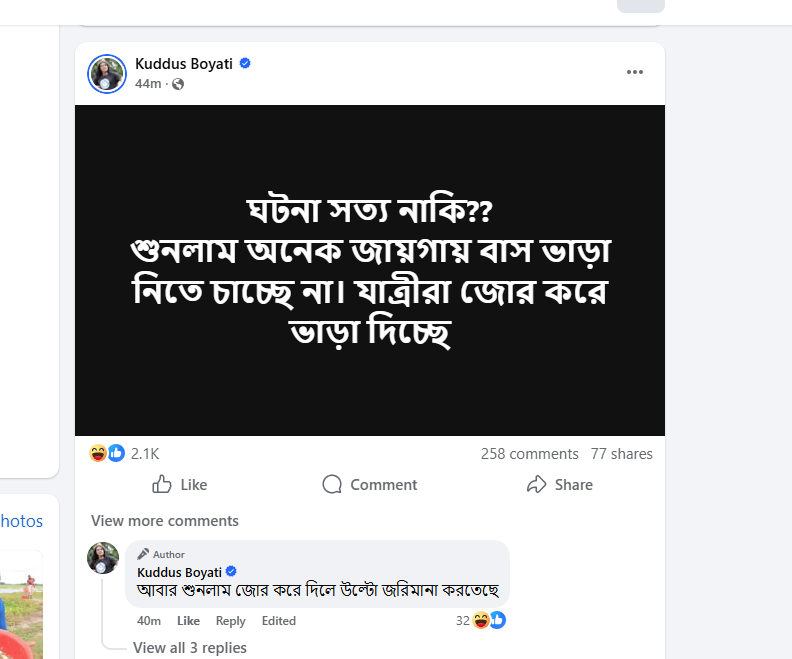 আজ বৃহস্পতিবার (১৯ মার্চ) ফেসবুকে তিনি এক পোস্টে তিনি লেখেন, ‘ঘটনা সত্য নাকি? শুনলাম অনেক জায়গায় বাস ভাড়া নিতে চাচ্ছে না। যাত্রীরা জোর করে ভাড়া দিচ্ছে।’