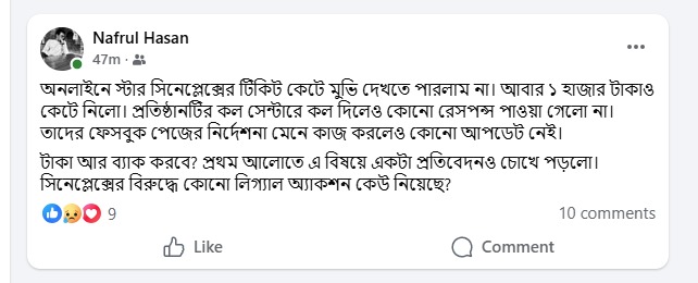 অমির অভিযোগ, অনলাইনে টিকিট কাটতে গিয়ে অর্থ পরিশোধ করার পরও তার বুকিং নিশ্চিত হয়নি। হটলাইনে যোগাযোগ করলে টিকিট কনফার্ম হয়েছে বলে জানানো হলেও প্রেক্ষাগৃহে গিয়ে তিনি জানতে পারেন, সার্ভার জটিলতার কারণে বুকিং সম্পন্ন হয়নি।