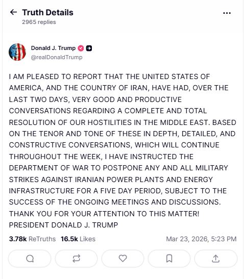 নিজের সামাজিক যোগাযোগমাধ্যম সোশ্যাল ট্রুথে দেওয়া এক বিবৃতিতে ট্রাম্প লিখেছেন, আমি আনন্দের সঙ্গে জানাচ্ছি যে, গত দুই দিনে যুক্তরাষ্ট্র ও ইরান মধ্যপ্রাচ্যে চলমান শত্রুতা সম্পূর্ণভাবে শেষ করার লক্ষ্যে খুব ভালো ও ফলপ্রসূ আলোচনা করেছে। এই গভীর, বিস্তারিত ও গঠনমূলক আলোচনা চলমান থাকবে। এর ভিত্তিতে আমি প্রতিরক্ষা বিভাগকে চলমান বৈঠকের অগ্রগতির ওপর নির্ভর করে পাঁচ দিনের জন্য ইরানের বিদ্যুৎকেন্দ্র ও জ্বালানি অবকাঠামোর ওপর সব ধরনের সামরিক হামলা স্থগিত রাখতে নির্দেশ দিয়েছি।