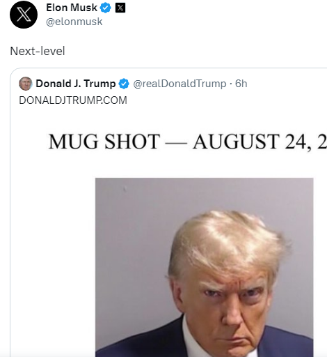 ট্রাম্পের ছবি শেয়ার করে ইলন মাস্ক লিখেছেন নেক্সট লেভেল। ২০২১ সালের জানুয়ারি মাসে শেষবার এই মাইক্রো ব্লগিং সাইটে অ্যাকটিভ ছিলেন তিনি। আর কামব্যাক করেই নিজের স্বভাবসিদ্ধ ভঙ্গিতে গ্রেফতারের ছবি দিয়ে সাড়া ফেলে দিলেন সাবেক মার্কিন প্রেসিডেন্ট।