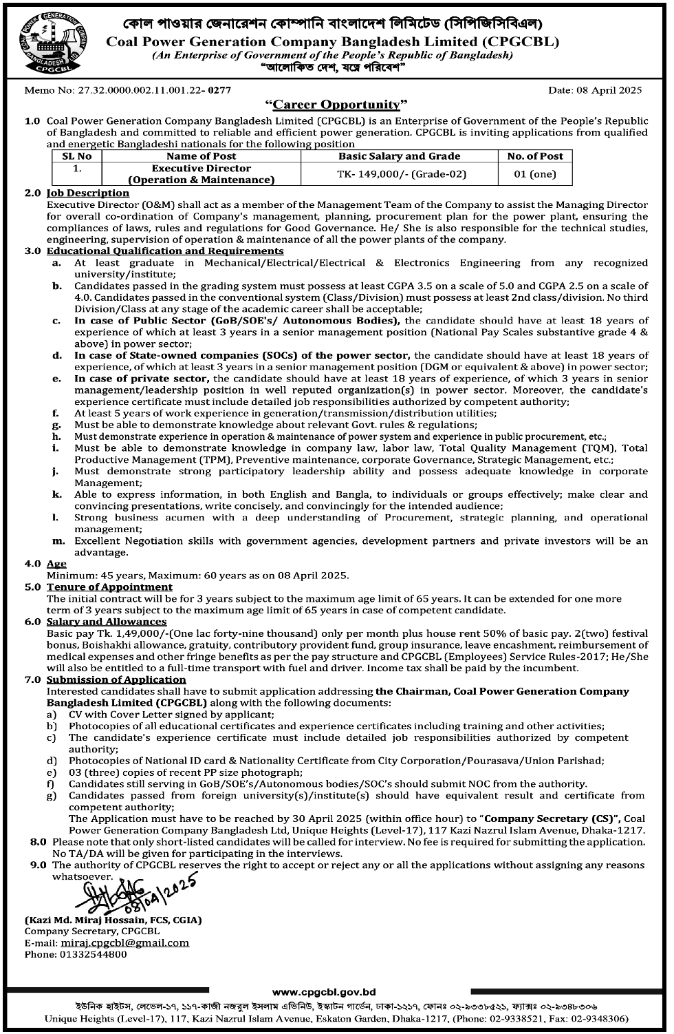 আবেদনের ঠিকানা: কম্পানি সেক্রেটারি (সিএস), কোল পাওয়ার জেনারেশন কোম্পানি বাংলাদেশ লিমিটেড (সিপিজিসিবিএল), ইউনিক হাইটস (লেভেল ১৭), ১১৭ কাজী নজরুল ইসলাম এভিনিউ, ইস্কাটন গার্ডেন, ঢাকা-১২১৭।