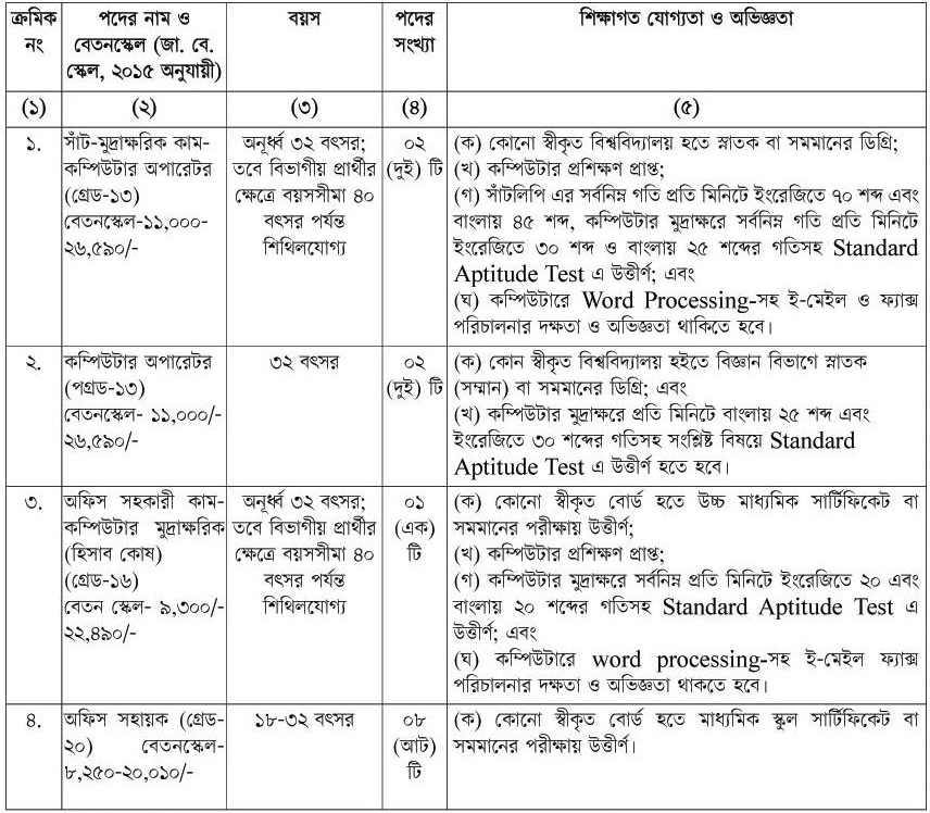 বয়স: ০১ এপ্রিল ২০২৫ তারিখ ১৮-৩২ বছর। উল্লেখিত ১-৩ নং পদের জন্য বিভাগীয় প্রার্থীর ক্ষেত্রে ৪০ বছর পর্যন্ত শিথিলযোগ্য। বয়স প্রমাণের ক্ষেত্রে কোনো প্রকার এফিডেভিট গ্রহণযোগ্য হবে না।
