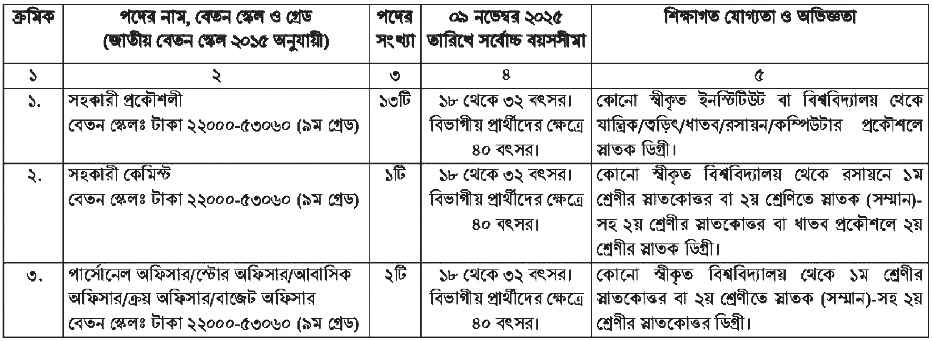 বয়স: ৯ নভেম্বর ২০২৫ তারিখ ১৮-৩২ বছর। তবে বিভাগীয় প্রার্থীদের ক্ষেত্রে ৪০ বছর পর্যন্ত শিথিলযোগ্য। বয়স প্রমাণের ক্ষেত্রে কোনো প্রকার এফিডেভিট গ্রহণযোগ্য হবে না।